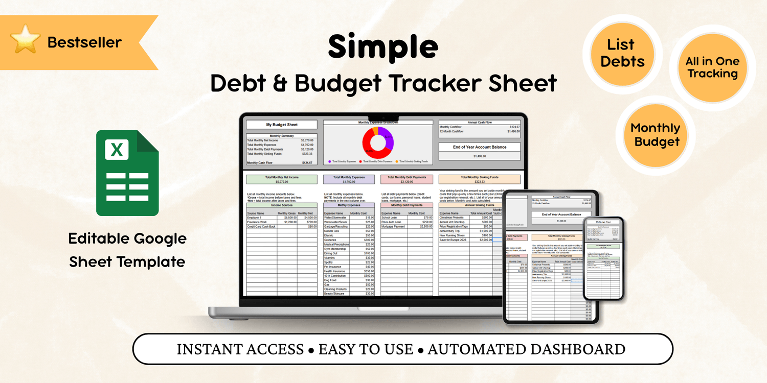 1 tab to list out all of your debts in one place, 1 tab to create an all-in-one monthly budgeting plan.